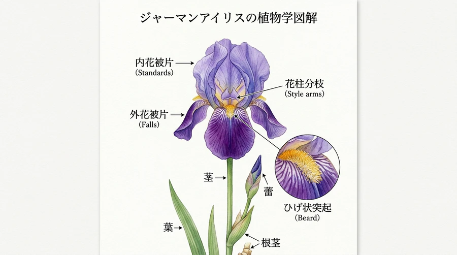 これらの構造が重なり合うことで、アイリス特有の奥行きのある、フリルのような華やかなシルエットが生まれます 。