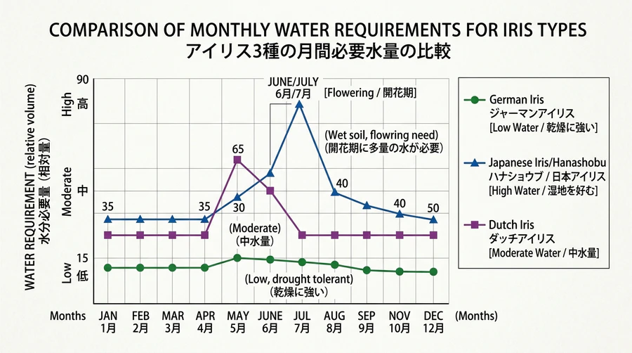 アイリスは種類によって、好む環境が「極端な乾燥」から「水生」まで大きく分かれます。初心者が陥りやすい最大の失敗は、すべてのアイリスを同じように育てようとすることです。
