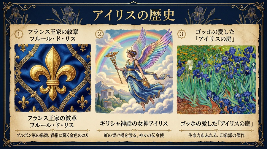 - フランス王家の紋章「フルール・ド・リス」: 百合の紋章として知られるこのデザインですが、実はアイリス(特に黄色いキショウブ)がモデルであるという説が有力です 。5世紀のフランク王クロヴィス1世が戦いの際、川辺のアイリスを見て浅瀬を見つけ、軍を勝利に導いたことが由来とされています 。
