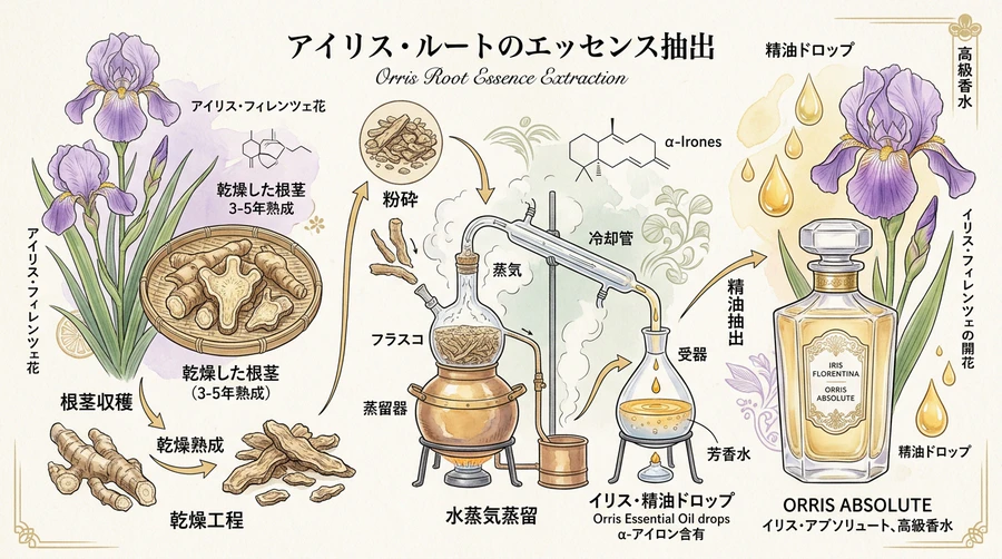 - 香料(オリリスルート): ニオイアヤメ(Iris florentina)の根茎を乾燥させたものは「オリリスルート」と呼ばれ、スミレに似た高貴な香りがします 。これは高級香水の保留剤(香りを長持ちさせる成分)として現在も世界中で利用されています 。