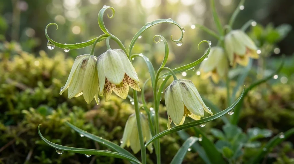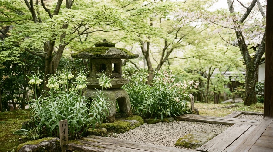 バイモは和風庭園だけでなく、モダンなシェードガーデンにも馴染みます。数輪を一輪挿しに生けるだけで、その場の空気が引き締まります [1]。