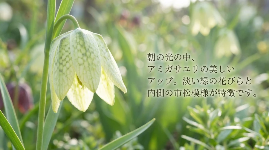 色彩の対比: 花被片(かひへん:花びらのこと)の外側は淡い黄緑色をしています [1]。しかし、花の中をのぞき込むと、そこには濃いえんじ色や紫褐色の網目模様が広がっています [1]。この模様が、伝統的な「編み笠(あみがさ)」のように見えることから、「アミガサユリ」という風雅な名前が付けられました [1]。