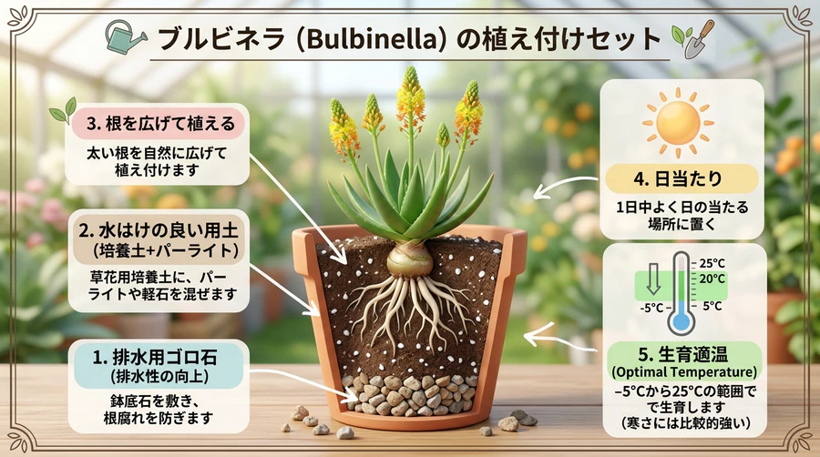 ブルビネラを育てる上で、絶対に忘れてはならない三つの要素があります。「日当たり」「水はけ」「夏の乾燥」です。