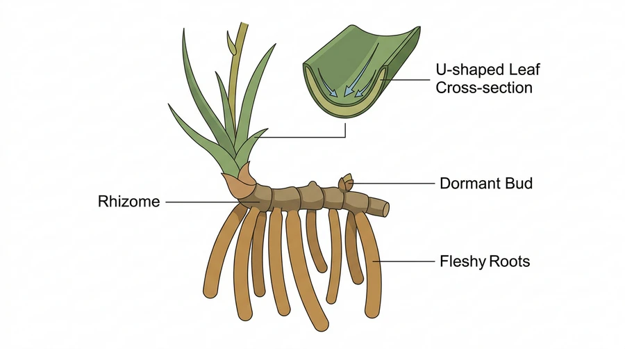 - 根茎と貯蔵根:地下には短い「根茎(こんけい)」があり、そこから太くて肉質な「貯蔵根(ちょぞうこん)」が何本も伸びています。 この太い根の中に、水分と養分をたっぷりと蓄えているため、夏の間、地上部が枯れて水がない状態でも生き抜くことができるのです。 まさに、植物自らが作り出した「天然の貯水タンク」と言えるでしょう。