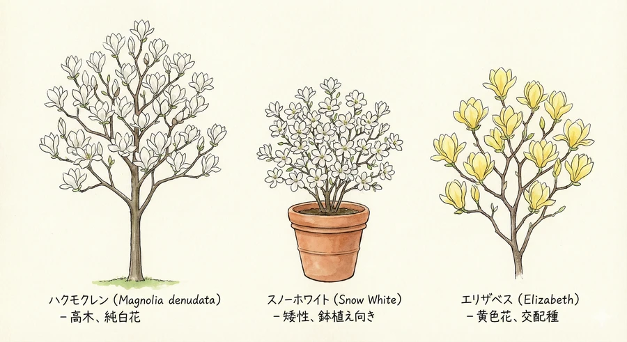 ハクモクレンと他のマグノリア属を掛け合わせたハイブリッド種です。「エリザベス」は北米産種との交配により、咲き始めが黄色い「黄花モクレン」として知られます。[6] また、「ジャパニーズクローン」や「レイシー」といった、20cm近い大輪を咲かせる選抜品種も存在します。[5]