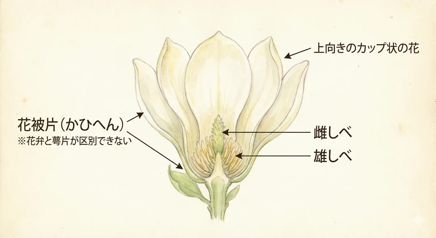 花被片(テパル): 通常の花は萼(がく)と花びらが分かれていますが、ハクレンは区別が明確ではなく、内側の6枚の花弁と外側の3枚の萼片がほぼ同じ姿をしています。[1]