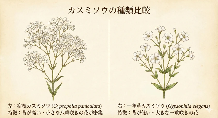 カスミソウはその生育型や特徴によって、いくつかのタイプに分類されます。主に流通しているのは、切り花として有名な宿根(しゅっこん)タイプと、ガーデニングで親しまれる一年草タイプです [6]。