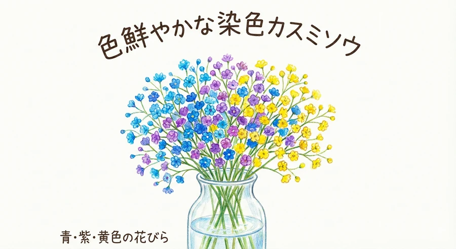 花の色彩は、本来は白やピンクですが、現代では「着色液(染色液)」を吸わせて染めたものも一般的です [8]。これにより、自然界には存在しない鮮やかな青色、水色、紫色、オレンジ色、さらには黄色や赤色のカスミソウも生花店で見かけることができます [8]。
