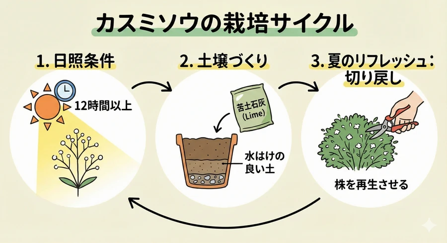 カスミソウを健康に育てるためのキーワードは、「日当たり」「風通し」「水はけ」です [5]。