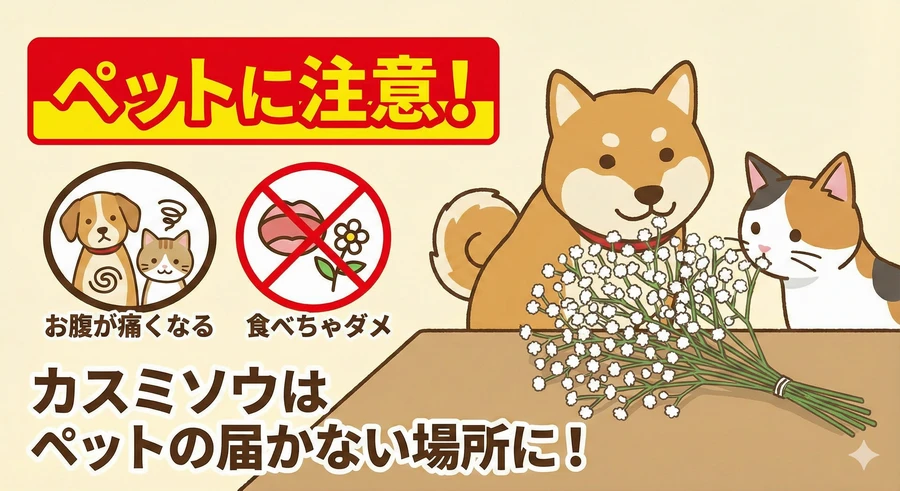毒性への注意: カスミソウ全体に含まれるサポニンには、経口毒性(食べると有害)や皮膚刺激性があります [30]。特に犬や猫にとっては危険で、誤食すると嘔吐や下痢を引き起こします [30]。ペットを飼っているご家庭では、手の届かない場所に置くなどの配慮が必要です [31]。