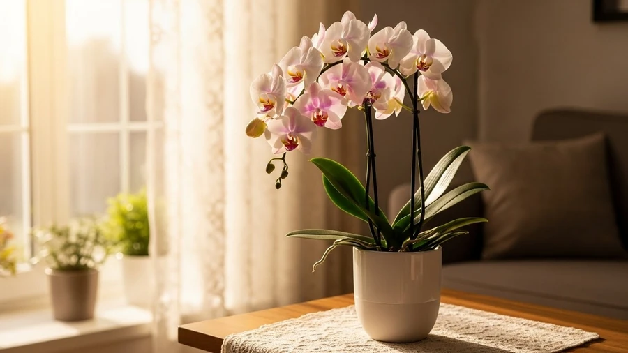 コチョウランの自生地は、東南アジアの熱帯雨林です。そこは年間を通して暖かく、適度な湿度があり、樹木の枝葉に遮られた「木漏れ日」が差し込む場所です [12]。この環境を家庭で再現するためのキーワードは「20℃前後」の温度管理です [12]。光については、直射日光は絶対に避けてください。強い光は葉の組織を破壊し、「葉焼け(はやけ)」という黒い斑点を作ってしまいます [12]。理想的なのは、レースのカーテン越しの柔らかい光が当たる場所です [23]。また、空気の動きも重要です。自生地では常に風が吹いているため、閉め切った部屋よりも、風通しの良い場所を好みます [2]。ただし、エアコンの風が直接当たる場所は乾燥しすぎてしまうため厳禁です [12]