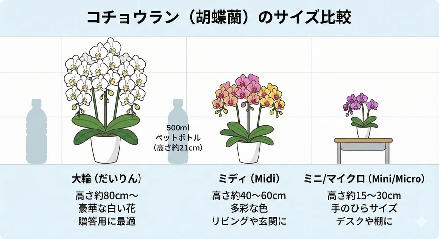 コチョウランは花の大きさによって主に「大輪(だいりん)」「中輪(ミディ)」「小輪(ミニ・マイクロ)」の3つのカテゴリーに分類されます [15]。以前は大型の白が主流でしたが、現代では住宅事情や好みの多様化に合わせて、コンパクトで色鮮やかな品種も数多く開発されています。