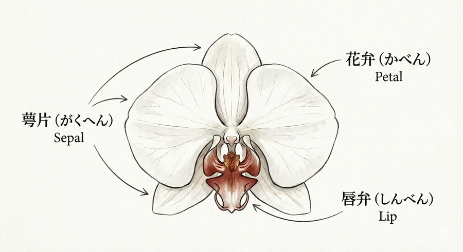 コチョウランの花は、完璧な左右対称(シンメトリー)の構造を持っています。一つの花は、3枚の「萼片(がくへん)」と、2枚の「花弁(かべん)」、そして中心にある「唇弁(しんべん/リップ)」で構成されています [5]。萼片は外側の3枚で、蕾の時に花を保護する役割を果たしていました。花が咲くと、上部に1枚、左右の下部に2枚配置され、花全体のフレームを作ります。その内側にある2枚の大きな花弁が、私たちが「蝶の羽」に見立てる部分です。そして最も特徴的なのが中心にあるリップ(唇弁)です。これは受粉を助けてくれる昆虫の着陸地点となる場所で、他の花びらとは異なる複雑な形や鮮やかな色をしています [2]。例えば「白赤(赤リップ)」と呼ばれる品種は、真っ白な花びらの中央に鮮やかな赤が差し込み、紅白のコントラストが非常におめでたい印象を与えます [2]