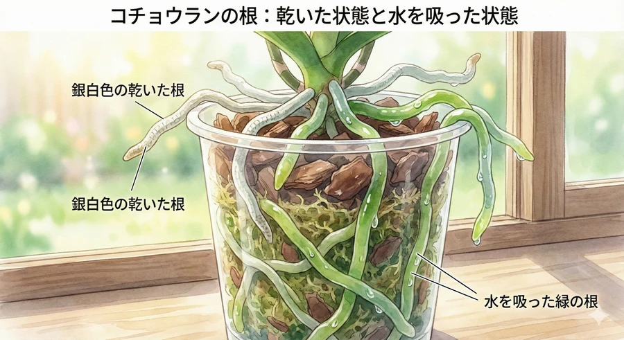 初心者の方が最も驚くのが、鉢から外に飛び出している白っぽい根の存在でしょう。これは「気根(きこん)」と呼ばれ、コチョウランの生態を象徴する重要な器官です [4]。コチョウランは樹木に着生して生きるため、地中の栄養を吸う通常の根とは異なり、空気中の湿度を効率よく吸収する能力を発達させました。根の表面を覆う「ベールマン細胞」は、スポンジのような多孔質構造をしており、霧や雨を瞬時に吸い込みます [4]。この細胞層があるため、乾燥している時の根は白銀色に見えますが、水分を吸収すると中の葉緑体が透けて鮮やかな緑色に変化します [4]。さらに驚くべきことに、コチョウランの根は葉と同じように光合成を行い、エネルギーを作り出すことができます [4]。これは、鬱蒼とした密林の樹上で、少しでも多くのエネルギーを確保するための生存戦略です。したがって、透明なプラスチック鉢を使用して根に光を当てる栽培方法は、理にかなった手法と言えます [25]