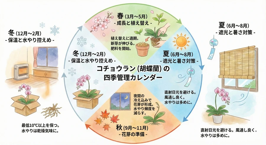 冬(12月〜3月)は、寒さとの戦いです。コチョウランの成長は止まり、休眠状態に入ります [26]。10℃以下になると枯れるリスクが高まるため、常に暖かいリビングなどで管理してください [3]。水やりは極限まで控え、2〜3週間に一度, 暖かい日中に少量与える程度にします [12]。空気が乾燥するため、霧吹きで葉の表面に水をかける「葉水(はみず)」を行うと、葉の健康を保つのに効果的です [23]
