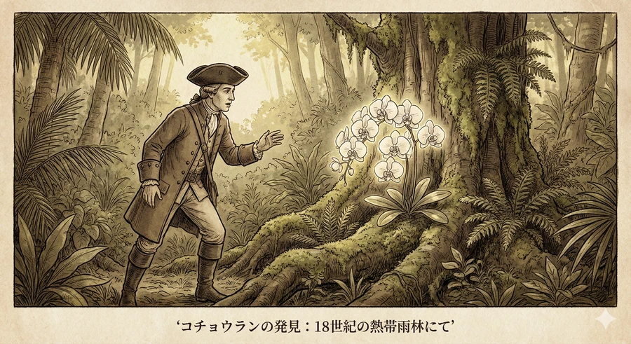 コチョウランの歴史は、1836年にイギリスの植物学者が熱帯アジアで原種を発見したことから始まります [6]。当初は今のような大輪ではなく、もっと小ぶりな花でした。イギリスの貴族たちの間で「東洋の神秘的な花」として熱狂的に迎えられ、より大きく美しい花を目指して熱心に品種改良が行われました [6]