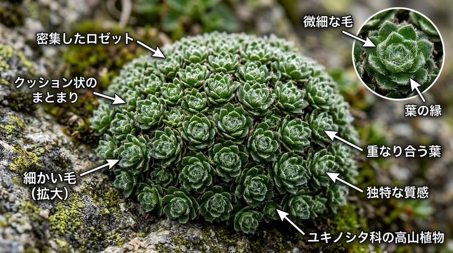 クッション状の形態: 多数の小さな芽が地面を這うように密生し、全体としてドーム状やマット状の「クッション」を形成します。これは強風や寒さ、乾燥から身を守るための適応です。
