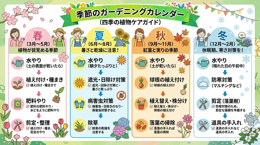 | 春(3-5月) | 開花期・植え替え期:日光をたっぷり当て、咲き終わった花(花がら)は病気予防のために摘み取ります。花後1ヶ月以内に植え替えを行いましょう。 |