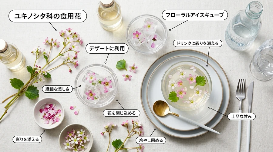 活用例: 花を水と一緒に凍らせて作る「フラワーアイスキューブ」は、ホームパーティーのドリンクをフォトジェニックに彩ります。