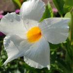 2023年8月18日、別荘に向かう途中の横河SAの花のガーデンで見かけた白色の花を付けたマンデビラ・サンデリを「Xiaomi Redmi Note 10 Pro」で撮影しました。