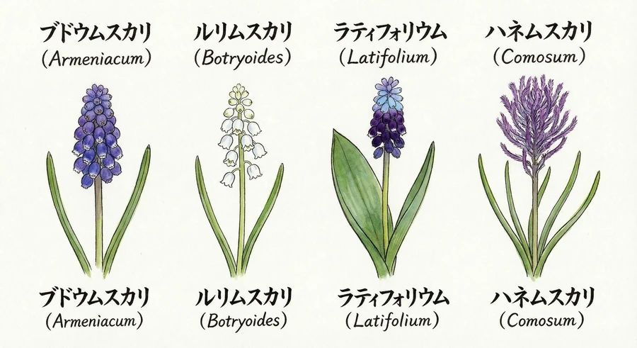 ムスカリはその生育型や特徴によって、非常に多くのタイプに分類されます。世界には約70〜73種ほどの原種が存在すると言われており、園芸品種も多岐にわたります [6]