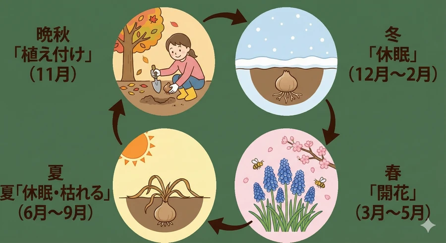 ムスカリは1年を通じて以下のようなサイクルで活動しています [2]