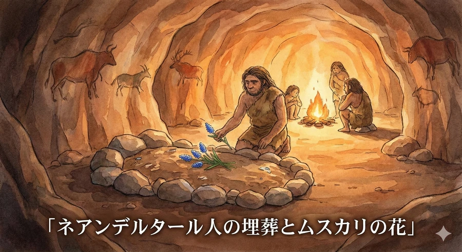 1960年、イラク北部のシャニダール洞窟で発見された約6万年前のネアンデルタール人の遺跡から、ムスカリの花粉が見つかりました [6]。これにより、ネアンデルタール人が死者を弔うために花を供えていた可能性が浮上し、ムスカリは「世界最古の埋葬花」として考古学的に非常に重要な存在となりました [6]