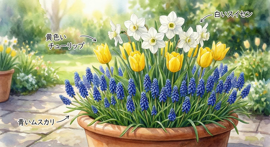 他の植物と一緒に鉢に植える「寄せ植え」でも主役を引き立てます [25]。鉢の中央に少し高く土を盛り、ムスカリを配置すると見栄えが良くなります [26]