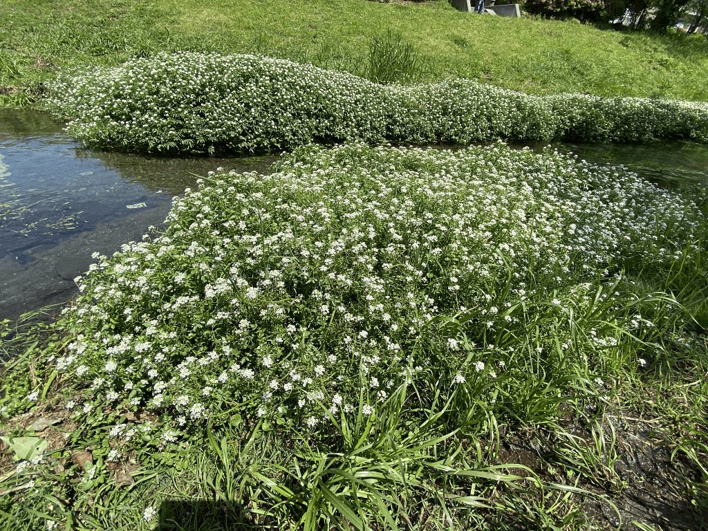近所の黒目川の清流沿いに咲いていた花です。春になるとよく見かける花で白い小さな花が群生して咲いていました。(2020年5月1日撮影)