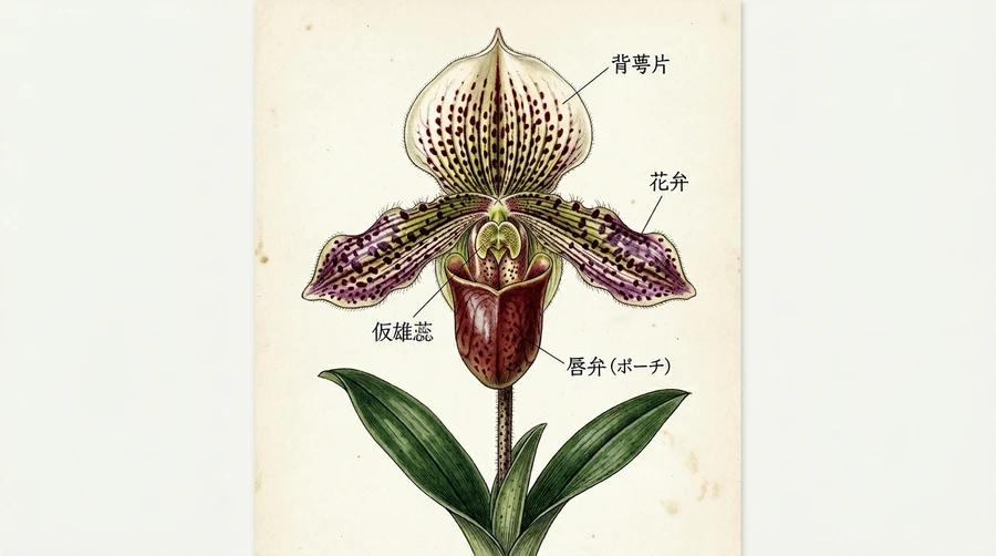 1. 唇弁(しんべん/リップ): 最も目立つ部分で、大きな袋状になっています 。この形が「スリッパ」に見えることから英名の由来となりました 。この袋は、昆虫を誘い込み、確実に受粉させるための「トラップ(落とし穴)」の役割を果たします 。