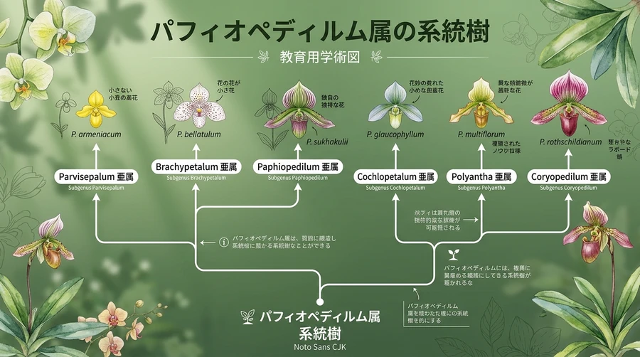 パフィオペディラムはその生育型や外見的特徴によって、いくつかのタイプに分類されます。それぞれのタイプによって好む環境が少しずつ異なるため、初心者はまず自分の株がどの系統に属するかを知ることが成功への近道です