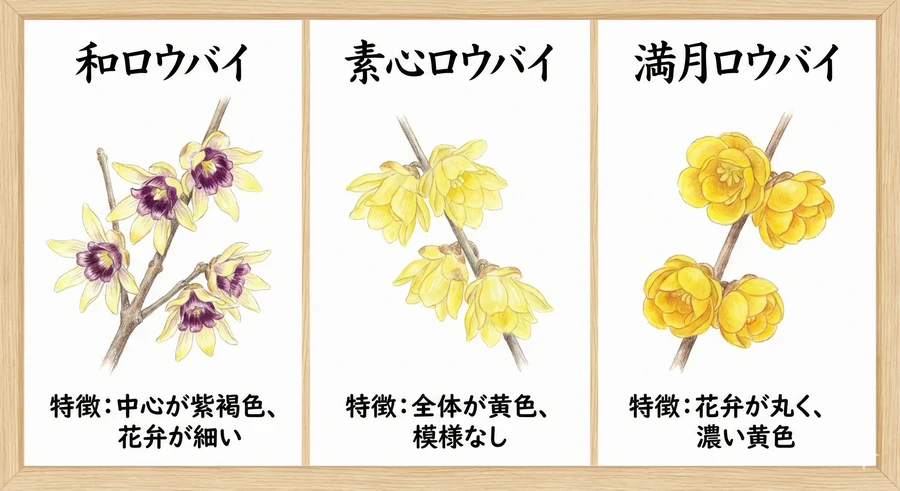 ロウバイはその生育型や特徴によって、いくつかのタイプに分類されます。特に庭木として流通している代表的な3つの種類を紹介します [1]。