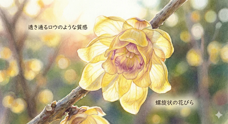 ロウバイの花は、品種によってさまざまな形や色を持ちますが、共通しているのは「半透明で光沢のある質感」です [1]。