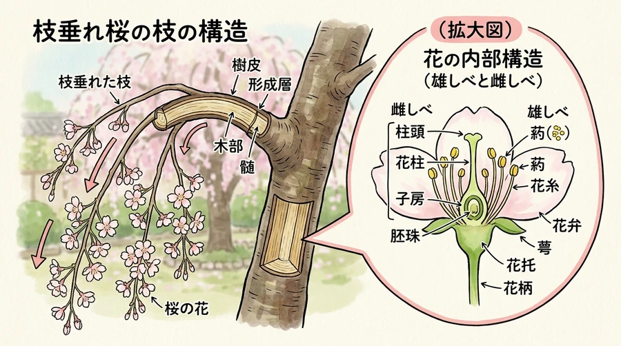 通常のサクラが天に向かって枝を伸ばすのに対し、なぜシダレザクラは地面に向かって垂れ下がるのでしょうか。これには植物生理学的な理由があります。