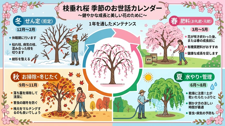 シダレザクラの美しさを最大限に引き出すためには、その生態と生育サイクルを正しく理解し、適切な手入れをすることが不可欠です。「サクラ切る馬鹿、ウメ切らぬ馬鹿」という言葉があるように、特に剪定には細心の注意が必要です 。