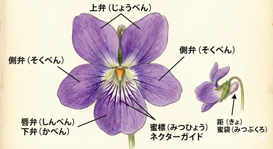 距(きょ): 唇弁の基部が後ろに突き出した袋状の部分で、スミレ属最大の特徴です 。この内部にある「蜜房(みつぼう)」で蜜が作られ、貯蔵されています 。距の長さや形は、特定の昆虫の口吻(こうふん:花の蜜を吸うための管状の口)の長さに対応して進化したと考えられています 。