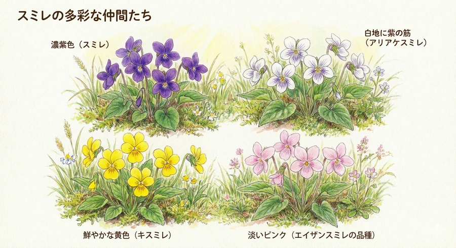 色彩についても、単なる紫にとどまらず、アリアケスミレのように白地に紫の脈が入る繊細なものや、黄色の鮮やかなキスミレ、ピンクに近い紅紫色のサクラスミレなど、種によって豊かなバリエーションを誇ります 。