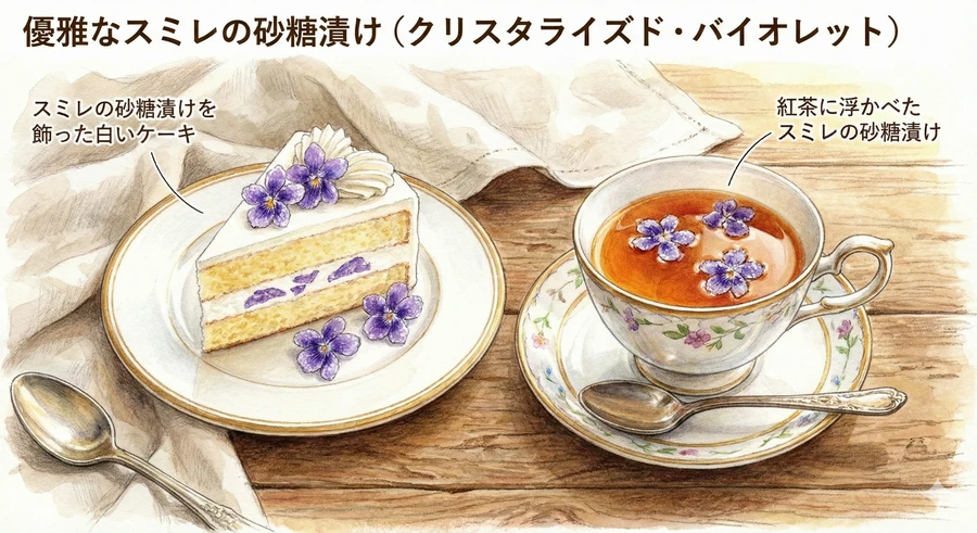 砂糖漬け(クリスタリゼ): 卵白(またはゼラチン液)とグラニュー糖で花をコーティングした伝統的な菓子。紅茶やシャンパンに浮かべたり、ケーキのトッピングとして使用されます 。