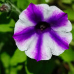 2023年8月21日、別荘付近の食事処の庭で見かけた白に紫のスジが入った花を付けたスーパーチュニアを「Xiaomi Redmi Note 10 Pro」で撮影しました。