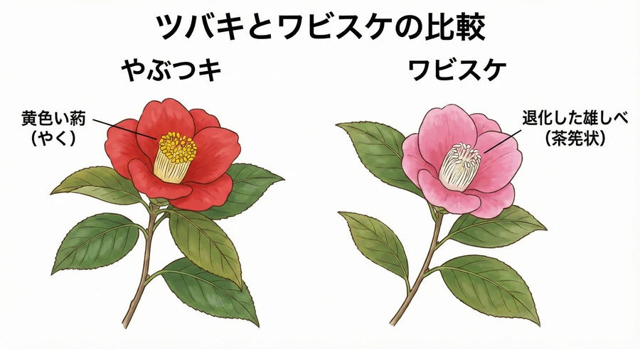 葯は持たないものの、太郎冠者とは直接の血縁がないヤブツバキの突然変異種などを指す場合があります。植物学的には区別されることがありますが、園芸上は「ワビスケ」として流通することも多いです。 [5]